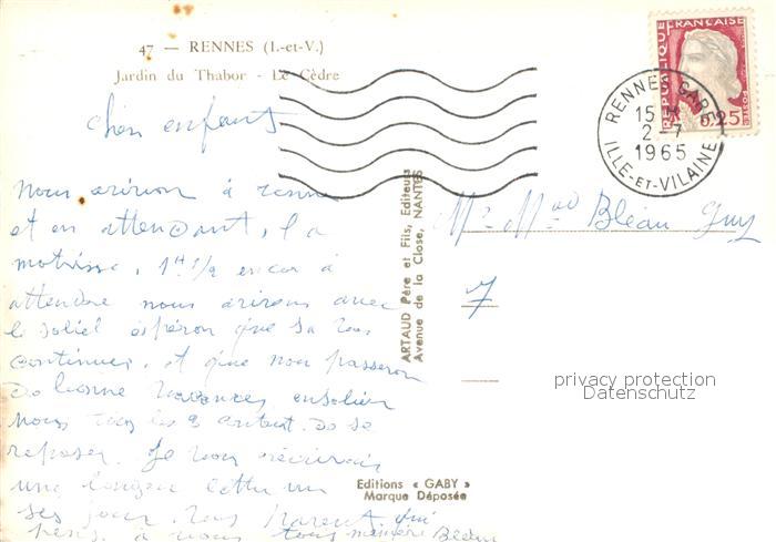 13573002 carte postale Rennes Ille-et-Vilaine Jardin du Thabor Le Cedre postalisch gelaufen Erhaltung siehe scans [WerneD78] KatCode: 11170035335238