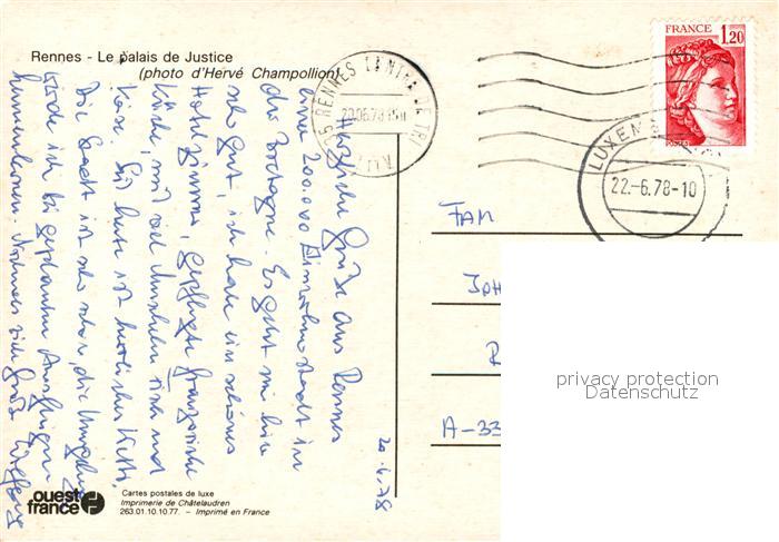 13224351 carte postale Rennes Ille-et-Vilaine Palais de Justice postalisch gelaufen Erhaltung siehe scans [FriedD77] KatCode: 11170035335238