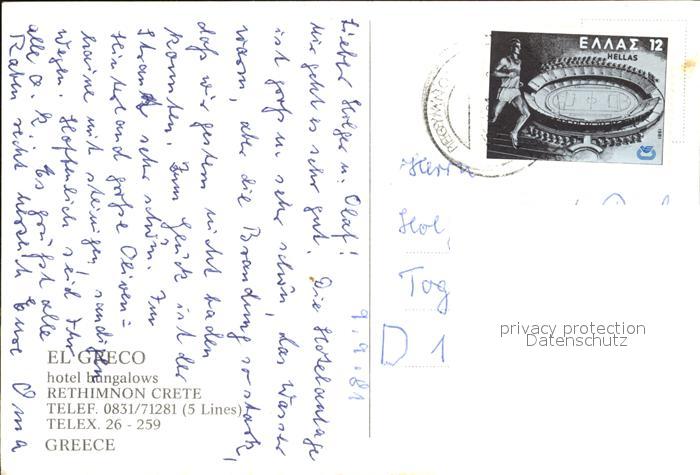 old postcard Rethymno Kreta El Grecco Hotel und Bungalows postalisch gelaufen Erhaltung siehe scans