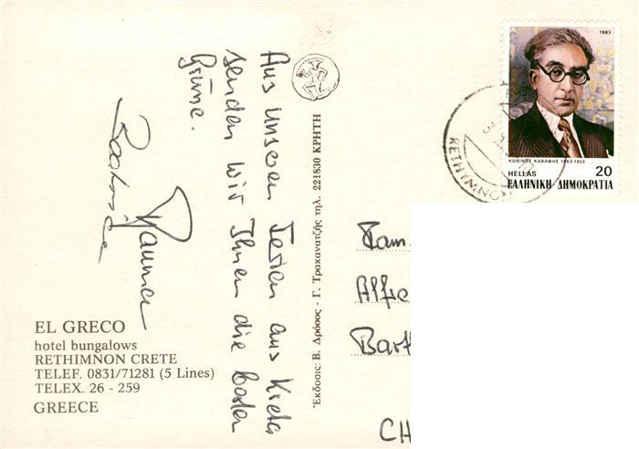 73907843 old postcard Rethymno Rethymnon Crete Greece El Greco Hotel Bungalows postalisch gelaufen Erhaltung siehe scans [FriedD77] KatCode: 11190