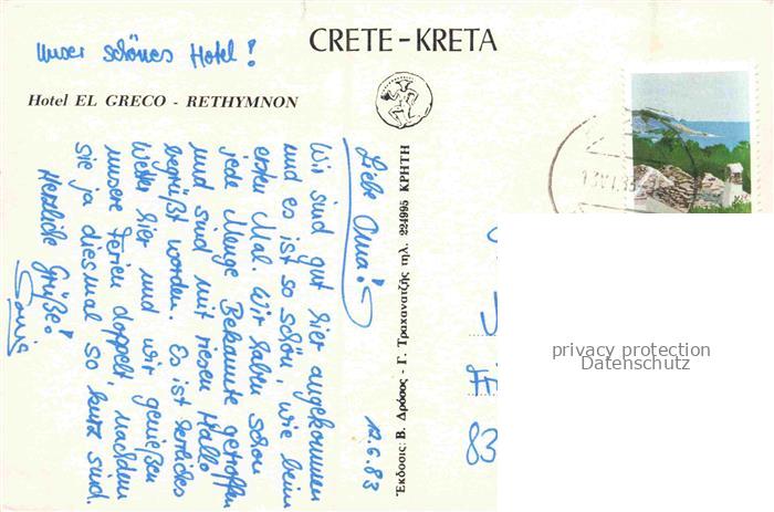 74157726 old postcard Rethymnon Rethimnon Crete Greece Hotel-El-Greco Pool Strand Meer Felder Hotelanlage postalisch gelaufen Fliegeraufnahme Erhaltung siehe scans [Karloger] KatCode: 11190