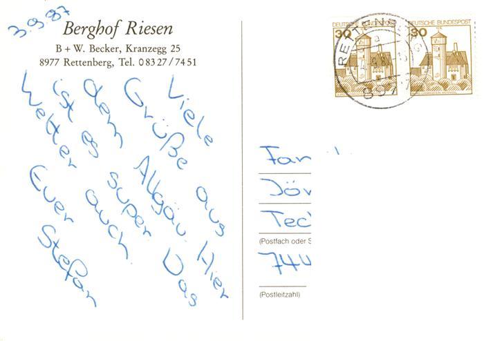 73885376 alte Postkarte Rettenberg Oberallgaeu Berghof Riesen postalisch gelaufen Erhaltung siehe scans [FriedD77] KatCode: 11110009780137