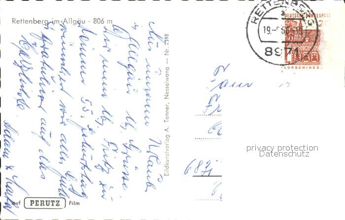 72090644 alte Postkarte Rettenberg Oberallgaeu Ortsansicht mit Kirche Allgaeuer Alpen Kuehe Edelweiss Bergbauernhof Denkmal postalisch gelaufen Erhaltung siehe scans KatCode: 11110009780137
