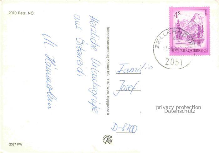 74005780 alte Postkarte Retz Weinviertel Niederoesterreich AT Windmuehlen Pestsaeule Marktplatz Brunnen postalisch gelaufen Erhaltung siehe scans [FriedD77] KatCode: 11390125031037