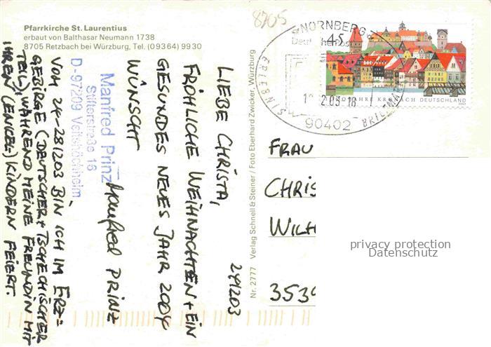 74054918 alte Postkarte Retzbach Zellingen PfarrkircheSt Laurentius postalisch gelaufen Erhaltung siehe scans [WerneD78] KatCode: 11110009677203