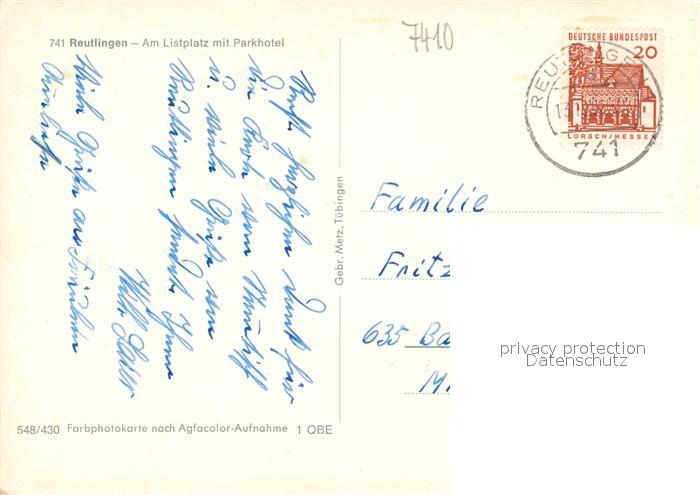 73163430 alte Postkarte Reutlingen BW Am Listplatz mit Parkhotel postalisch gelaufen Erhaltung siehe scans [WerneD78] KatCode: 11110008415061
