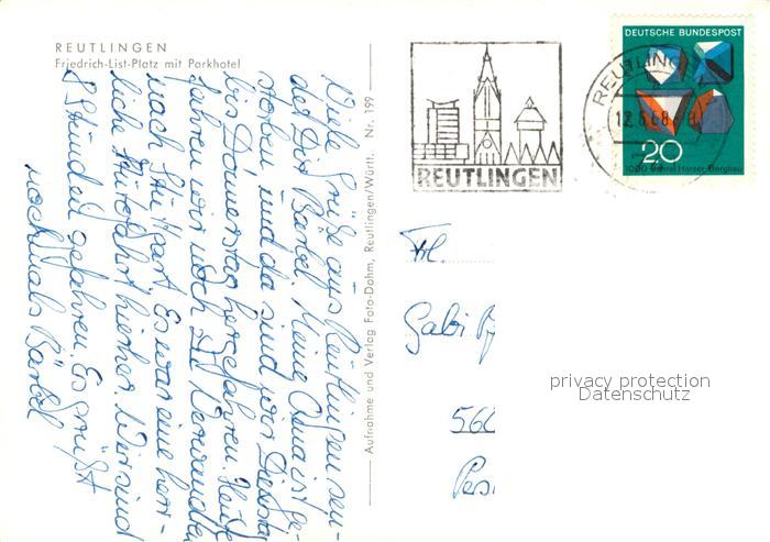 73310780 alte Postkarte Reutlingen BW Friedrich List Platz mit Parkhotel Tulpenbeet postalisch gelaufen Erhaltung siehe scans [FriedD77] KatCode: 11110008415061