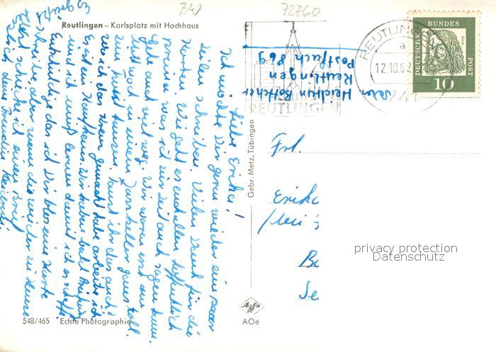 33665137 alte Postkarte Reutlingen BW Karlsplatz mit Hochhaus postalisch gelaufen Erhaltung siehe scans [FriedD77] KatCode: 11110008415061