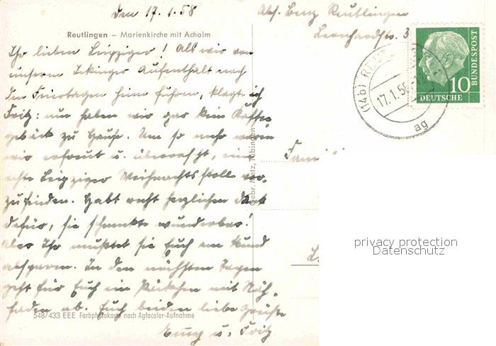 72641315 alte Postkarte Reutlingen BW Marienkirche mit Achalm Hausberg der Stadt postalisch gelaufen Erhaltung siehe scans [FriedD77] KatCode: 11110008415061