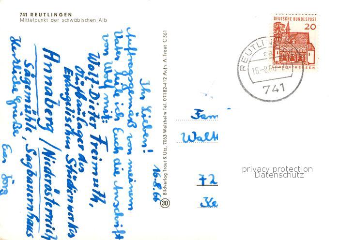 73829758 alte Postkarte Reutlingen BW Marienkirche Tuebinger Tor Lindenbrunnen Teilansicht und Achalm postalisch gelaufen Erhaltung siehe scans [FriedD77] KatCode: 11110008415061