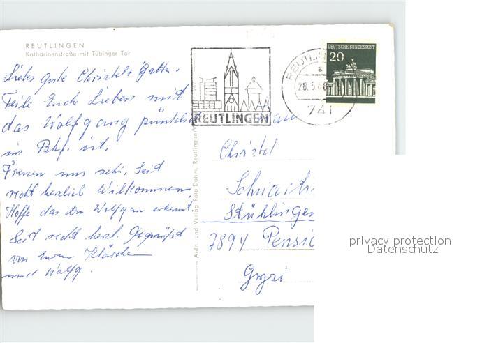 72037018 alte Postkarte Reutlingen Katharinenstrasse Tuebinger Tor postalisch gelaufen Erhaltung siehe scans KatCode: 11110008415061