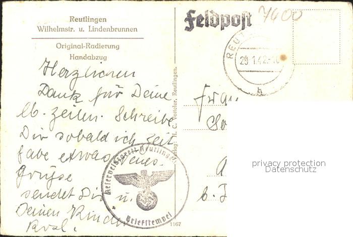 31722376 alte Postkarte Reutlingen Wilhelmstr. u. Lindenbrunnen Original-Radierung Handabzug NZ3 postalisch gelaufen Feldpost Erhaltung siehe scans KatCode: 11110008415061