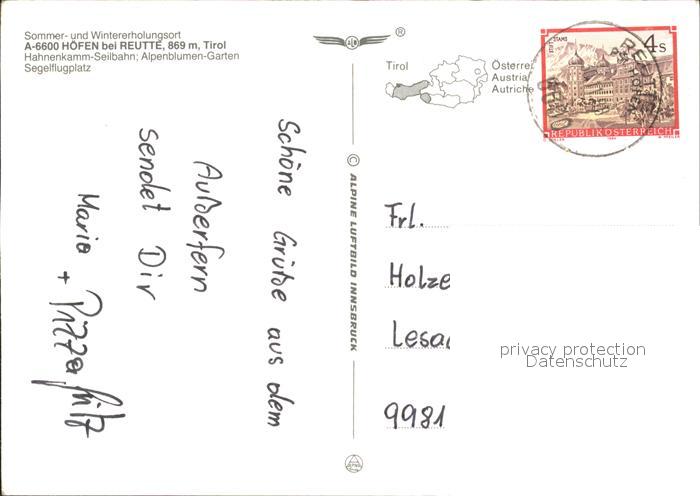 71914384 alte Postkarte Reutte Tirol Fliegeraufnahme Hoefen Hahnenkamm-Seilbahn postalisch gelaufen Erhaltung siehe scans KatCode: 11390331070828