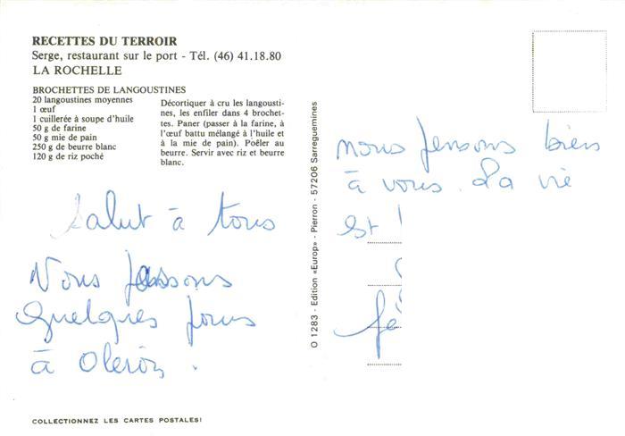 74030085 Rezept Recette– Brochettes Langoustines La Rochelle postalisch nicht gelaufen Erhaltung siehe scans [SanaeD93] KatCode: 22280