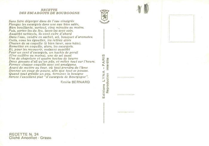 74026997 Rezept Recette– des Escargots de Bourgogne Emilie Bernard postalisch nicht gelaufen Erhaltung siehe scans [SanaeD93] KatCode: 22280
