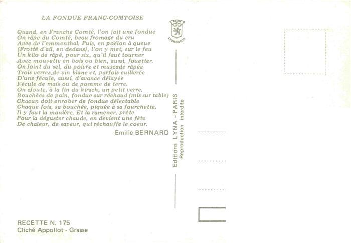 74026066 Rezept Recette– Fondue Franc Comtoise postalisch nicht gelaufen Erhaltung siehe scans [SanaeD93] KatCode: 22280