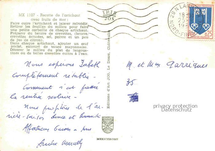 74021872 Rezept Recette– L’artichaut fruits de mer postalisch nicht gelaufen Erhaltung siehe scans [SanaeD93] KatCode: 22280