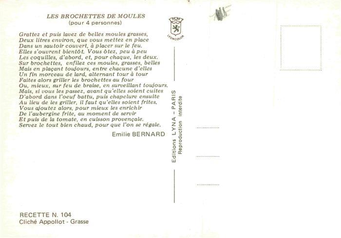 74030168 Rezept Recette– les Brochettes de Moules postalisch nicht gelaufen Erhaltung siehe scans [SanaeD93] KatCode: 22280