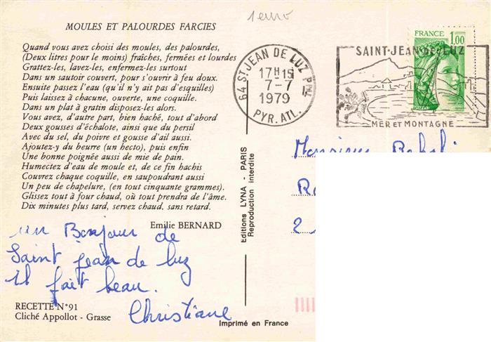 74028252 alte Postkarte Rezept Recette– Moules et Palourdes farcier postalisch gelaufen Erhaltung siehe scans [SanaeD93] KatCode: 22280