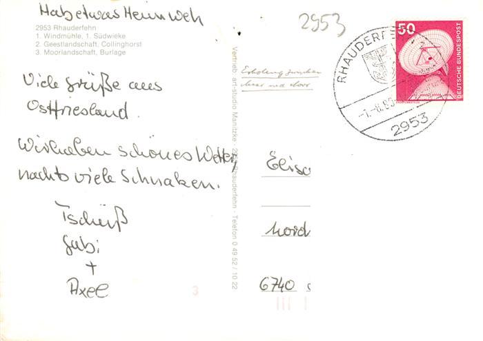 73930618 alte Postkarte Rhauderfehn Windmuehle Suedwerke Geestlandschaft Collinghort Moorlandschaft Burlage postalisch gelaufen Erhaltung siehe scans [WerneD78] KatCode: 11110003457018