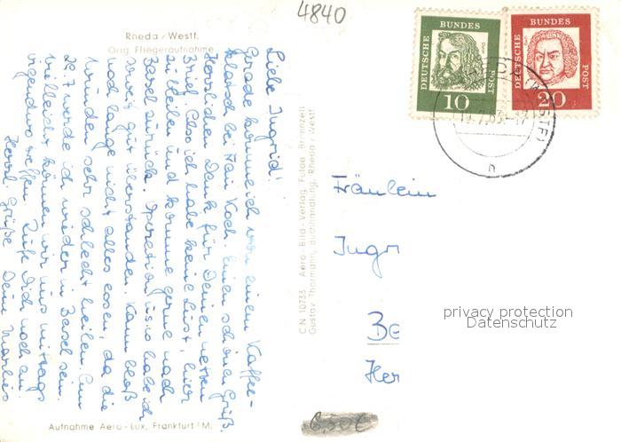 73695801 alte Postkarte Rheda-Wiedenbrueck Fliegeraufnahme postalisch gelaufen Erhaltung siehe scans [LiesaD40] KatCode: 11110005754028