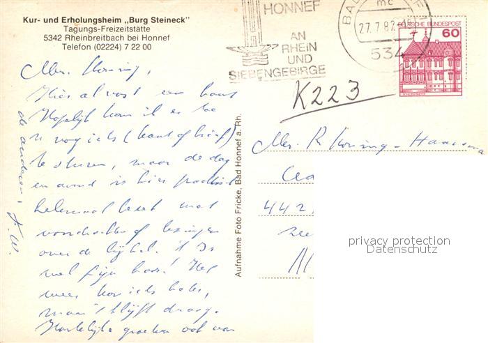 72932498 alte Postkarte Rheinbreitbach Kur und Erholungsheim Burg Steineck postalisch gelaufen Erhaltung siehe scans [WerneD78] KatCode: 11110007138062