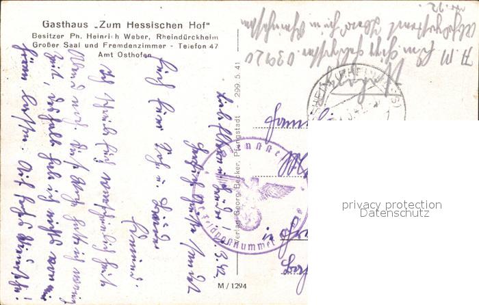 31884893 alte Postkarte Rheinduerkheim Gasthaus zum Hessischen Hof A.H.-Strasse Rathaus NZ3 postalisch gelaufen Feldpost Erhaltung siehe scans KatCode: 11110007319000