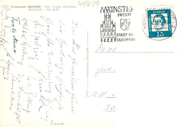 73869028 alte Postkarte Rheine Restaurant Waldhof Bar Gaststube Kegelbahn postalisch gelaufen Erhaltung siehe scans [FriedD77] KatCode: 11110005566076