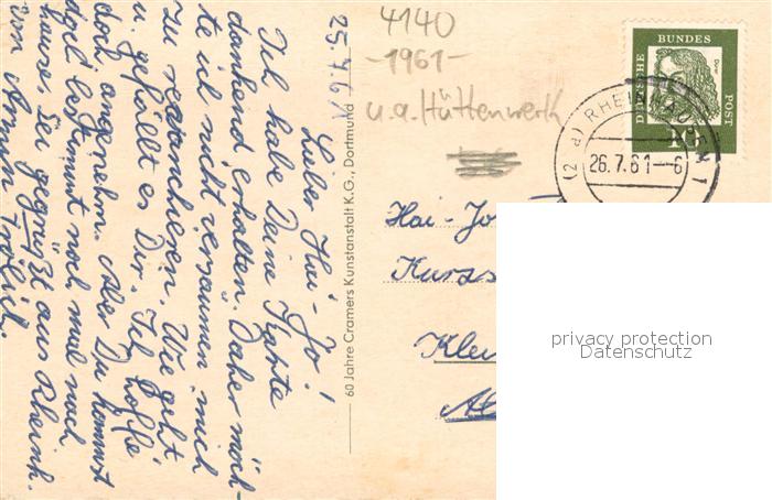 73693402 alte Postkarte Rheinhausen Duisburg Stadtkerngebiet Jugendheim Kaiserstrasse Freibad Kruppsee Rheinbruecke Krefelder Strasse Verwaltung Huettenwerk Volkspark postalisch gelaufen Erhaltung siehe scans [WerneD78] KatCode: 11110005112000
