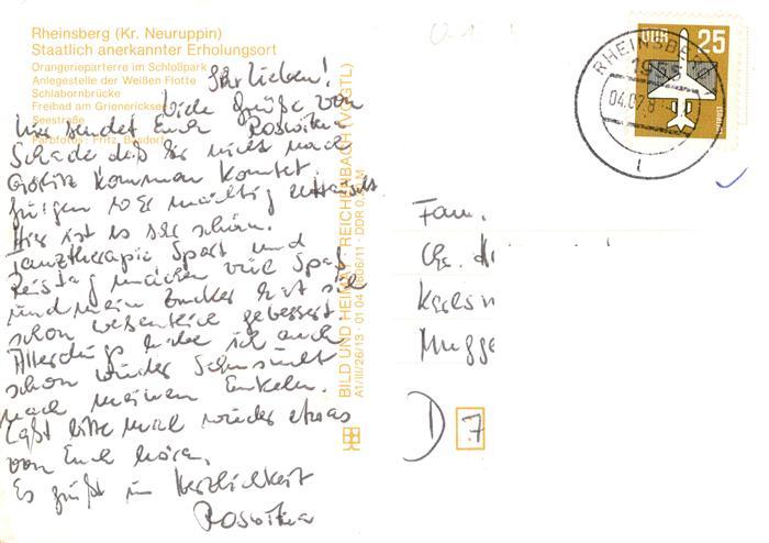 73948065 alte Postkarte Rheinsberg Brandenburg Orangerieparterre im Schlosspark Anlegestelle der Weissen Flotte Schlabornbruecke Freibad am Grienericksee Seestrasse postalisch gelaufen Erhaltung siehe scans [WerneD78] KatCode: 11110012068353