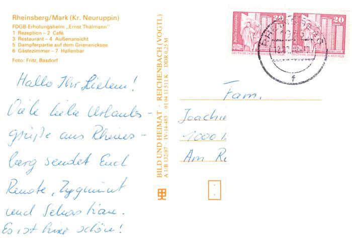 73924248 alte Postkarte Rheinsberg FDGB Erholungsheim Ernst Thaelmann Rezeption Cafe Restaurant Aussenansicht Dampfeerpartie auf dem Grienericksee Gaestezimmer Hallenbar postalisch gelaufen Erhaltung siehe scans [FriedD77] KatCode: 11110012068353