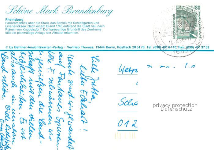 73205132 alte Postkarte Rheinsberg Fliegeraufnahme Schloss Grienericksee postalisch gelaufen Erhaltung siehe scans [NatalD47] KatCode: 11110012068353