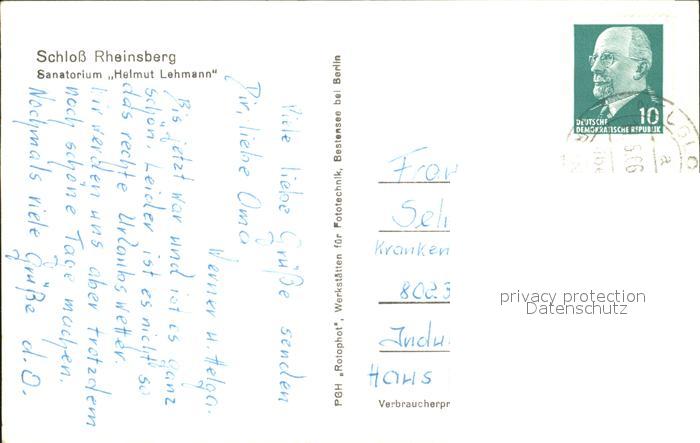 72357404 alte Postkarte Rheinsberg Schloss Rheinsberg Sanatorium Helmut Lehmann postalisch gelaufen Erhaltung siehe scans KatCode: 11110012068353