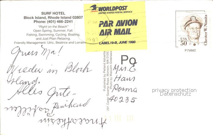 72253185 old postcard Rhode Island US-State Surf Hotel Block Island Kreuzfahrtschiff postalisch gelaufen Erhaltung siehe scans KatCode: 14140420000000
