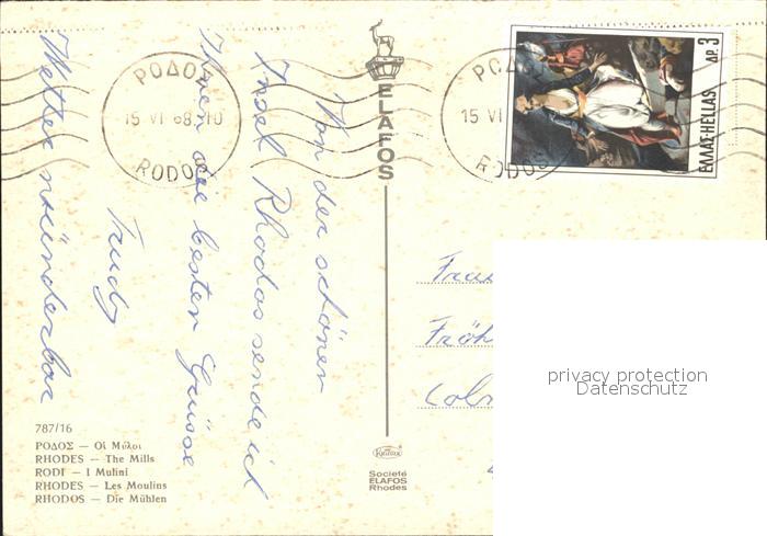 old postcard Rhodes Rhodos Greece Die Muehlen Hafenpartie postalisch gelaufen Erhaltung siehe scans