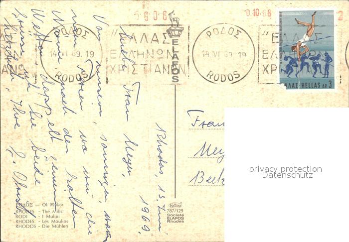 old postcard Rhodes Rhodos Greece Die Muehlen postalisch gelaufen Erhaltung siehe scans