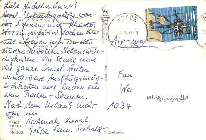 old postcard Rhodes Rhodos Greece Hafeneinfahrt Strand Hafen Festung postalisch gelaufen Erhaltung siehe scans