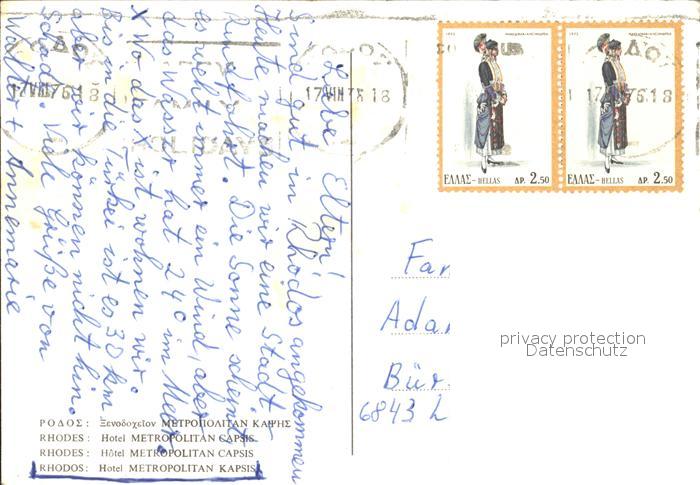old postcard Rhodes Rhodos Greece Metropolitan Capsis Hotel Strand postalisch gelaufen Erhaltung siehe scans