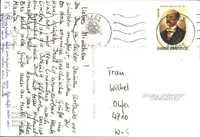 old postcard Rhodes Rhodos Greece Teilansichten Ritterpalast Arkaden Ruestung Windmuehle postalisch gelaufen Erhaltung siehe scans