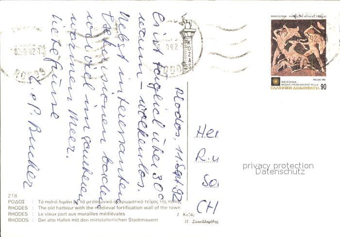 old postcard Rhodos Rhodes aegaeis Alter Hafen mit mittelalterlichen Stadtmauern postalisch gelaufen Erhaltung siehe scans