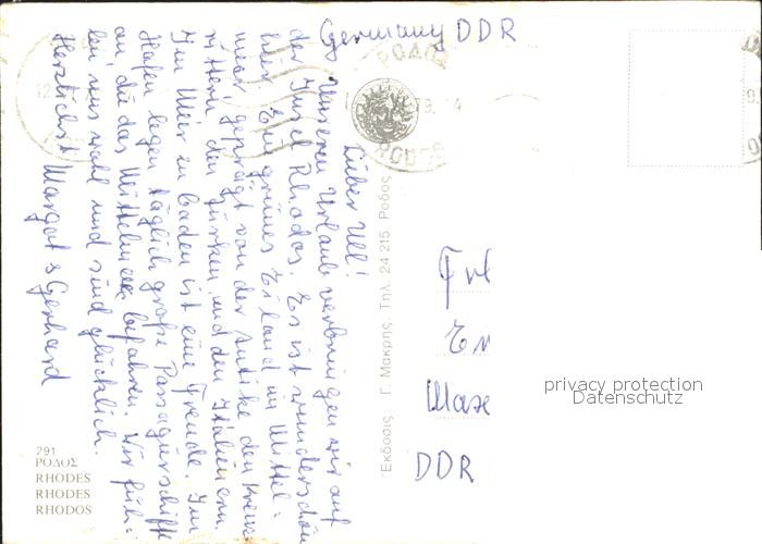 old postcard Rhodos Rhodes aegaeis Aphrodite Statue Akropolis Lindos Castello Altstadt Windmuehle Tempel Antike Trachten Sonne postalisch gelaufen Erhaltung siehe scans