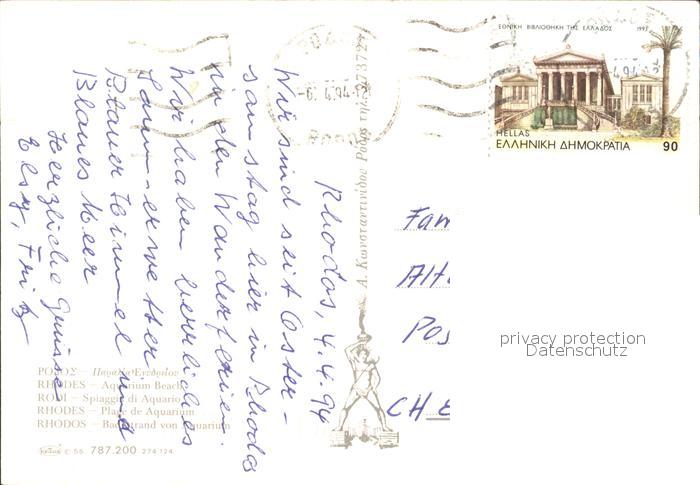 old postcard Rhodos Rhodes aegaeis Badestrand von Aquarium postalisch gelaufen Erhaltung siehe scans
