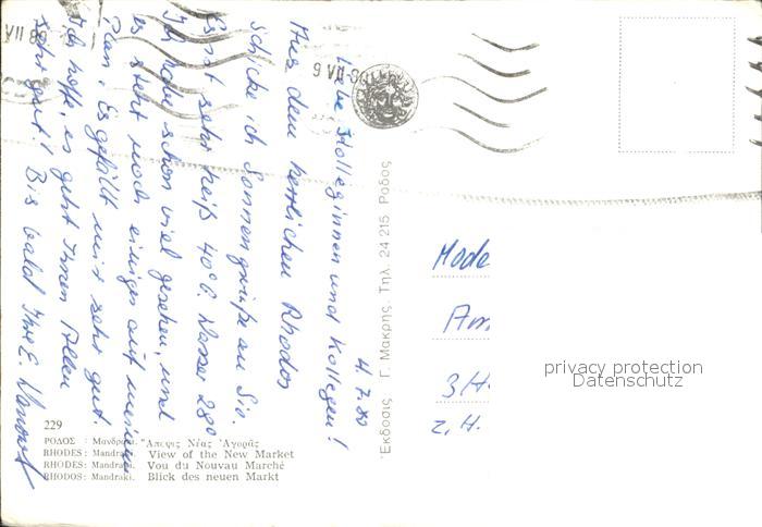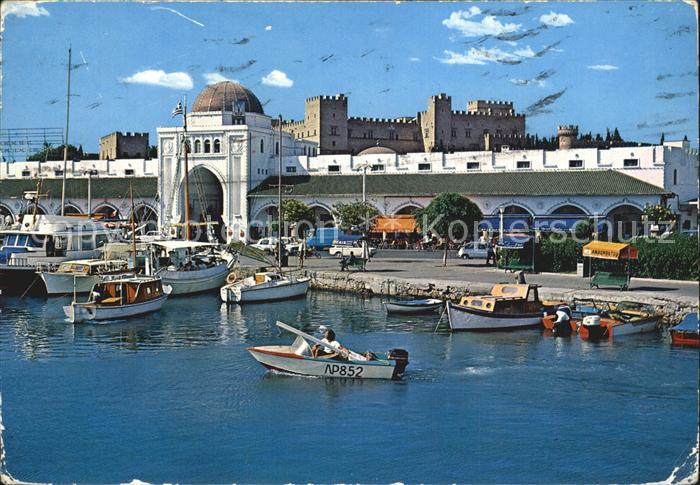 old postcard Rhodos Rhodes aegaeis Blick zum Neuen Markt Hafen postalisch gelaufen Erhaltung siehe scans
