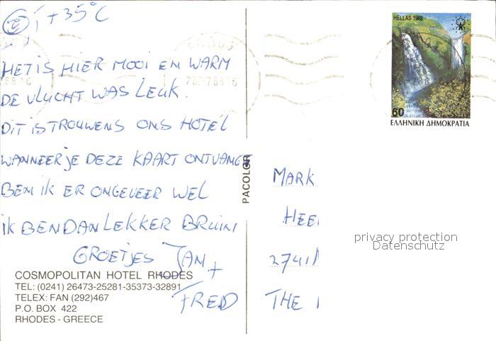 old postcard Rhodos Rhodes aegaeis Cosmopolitan Hotel Rhodes postalisch gelaufen Erhaltung siehe scans