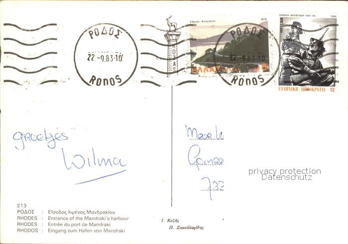 old postcard Rhodos Rhodes aegaeis Eingang Hafen Mandraki postalisch gelaufen Erhaltung siehe scans