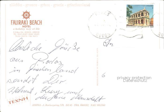 old postcard Rhodos Rhodes aegaeis Faliraki Beach Hotel Rezeption Fliegeraufnahme postalisch gelaufen Erhaltung siehe scans