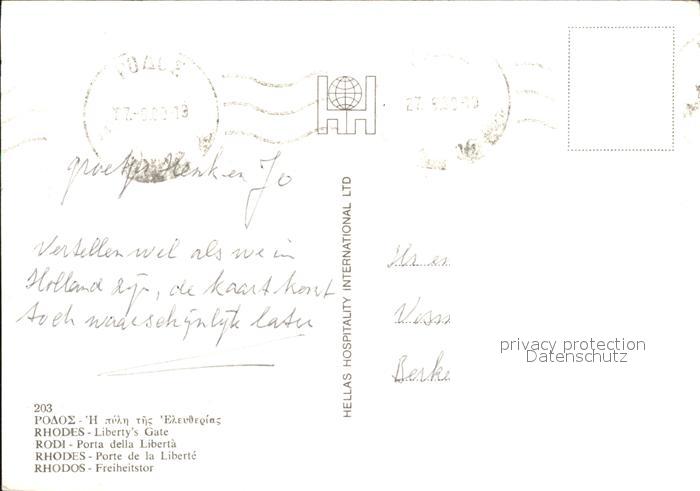 old postcard Rhodos Rhodes aegaeis Freiheitstor postalisch gelaufen Erhaltung siehe scans [LiesaD40]