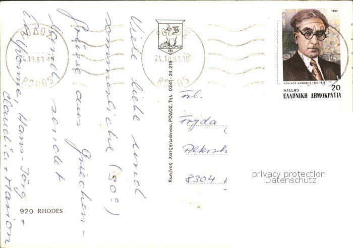 old postcard Rhodos Rhodes aegaeis Hafen Windmuehle Palast Strand postalisch gelaufen Erhaltung siehe scans