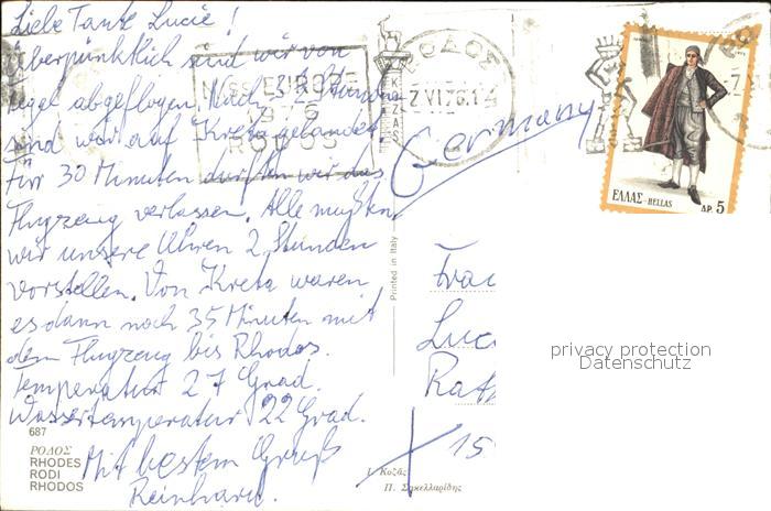 old postcard Rhodos Rhodes aegaeis Hafeneinfahrt Strand Hafenansicht Festung postalisch gelaufen Erhaltung siehe scans