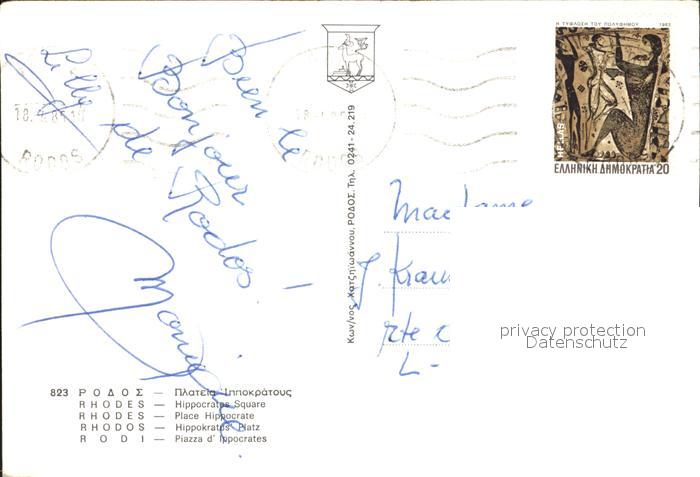 old postcard Rhodos Rhodes aegaeis Hippokratus Platz postalisch gelaufen Erhaltung siehe scans